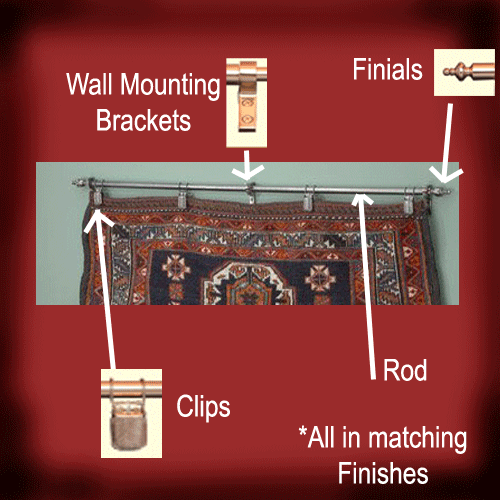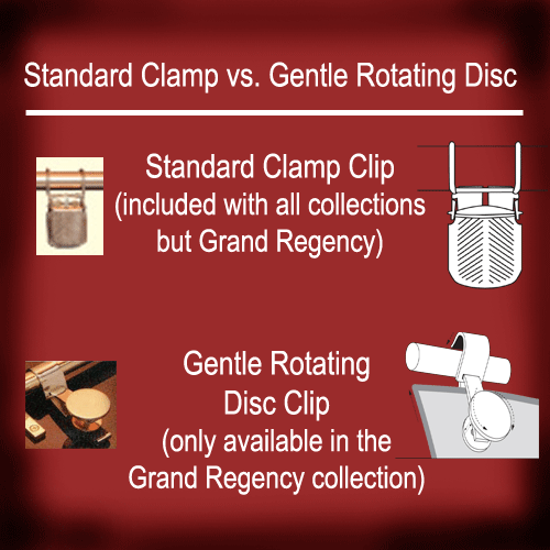 All collections but the Grand Regency come with the standard clamp clip design (see photo below). None of the Zoroufy clamp designs will harm tapestries, but if you have a very fragile rug or the thought of clips on your tapestry makes you worry, you may want to go with the Grand Regency collection, which has a rotating disc with a gentle design (see photo below).