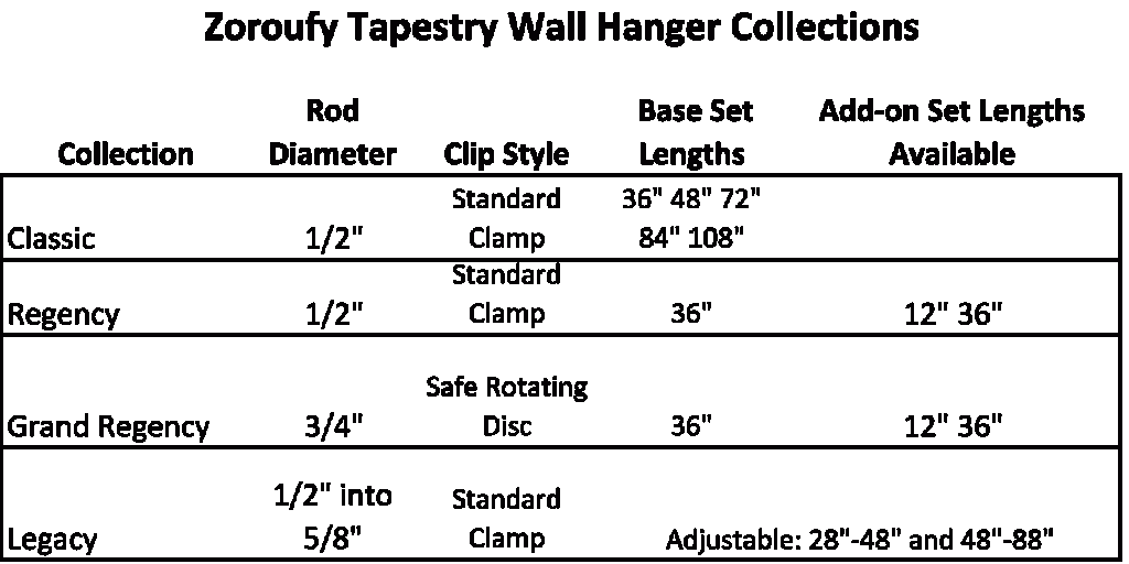 Prices of stair rods vary from collection to collection. Zoroufy Grand Regency stair rods are more expensive than say the Select Stair Rods because of the decorative brackets and larger rod diameter. It may be daunting to view all the collections at once, so below is a chart of the different collections Zoroufy offers, and what each has to offer.