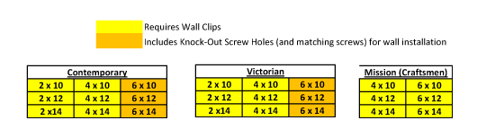 Different sizes from each line of decorative registers require the use of wall clips (purchased separately) or include knock-out screw holes and matching screws for installation into the wall duct work. The Contemporary and Victorian style registers in size 6×10-6×12-6×14 have knock out screw holes on the front faceplate which allows for easy installation into the walls (matching plated screws included). The remaining sizes (2×10-4×14) require the use of the wall clips. All sizes of registers in the Mission (Craftsmen) style require the use of wall mounting clips. Below is a chart to better understand which registers require wall clips for wall installation and which do not.