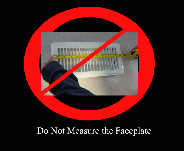 A register/grille faceplate will differ from style to style and manufacturer to manufacturer. The packaging of the floor register or listing on a website, will have the opening dimensions. The faceplate dimensions should be listed in the description- but that will not be the main number identifier, nor will you likely find a replacement register/grille that will have the exact same faceplate dimensions. Standard floor registers and grilles will an even-whole number (measurement)- for example 2, 4, 6, 8, 10 etc. There are some registers out there that can work for 3″ opening sizes- but choices are limited. If you have let’s say a 2″ x 11″ opening- you may want to try to extend the hole size by 1″ so you can get the standard size 2 x 12 register. Otherwise, you may have to get something custom-made for your opening.