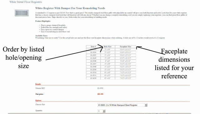 1)Duct size… Make sure you have the actual opening/duct size of your register. Wall registers or grilles are listed by width (horizontal) x height (vertical).